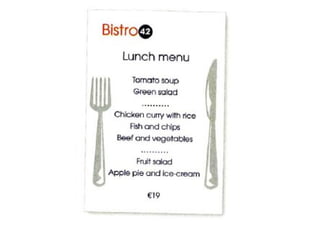 The document provides information about ordering food at a restaurant, including sample dialogues between customers and waiters. It also includes a recipe for vegetable soup and prompts the reader to listen to descriptions of dishes on a menu and identify adjectives used to describe the food. Finally, it lists words that can be used to describe food and asks the reader to categorize them as positive, neutral, or negative descriptions.