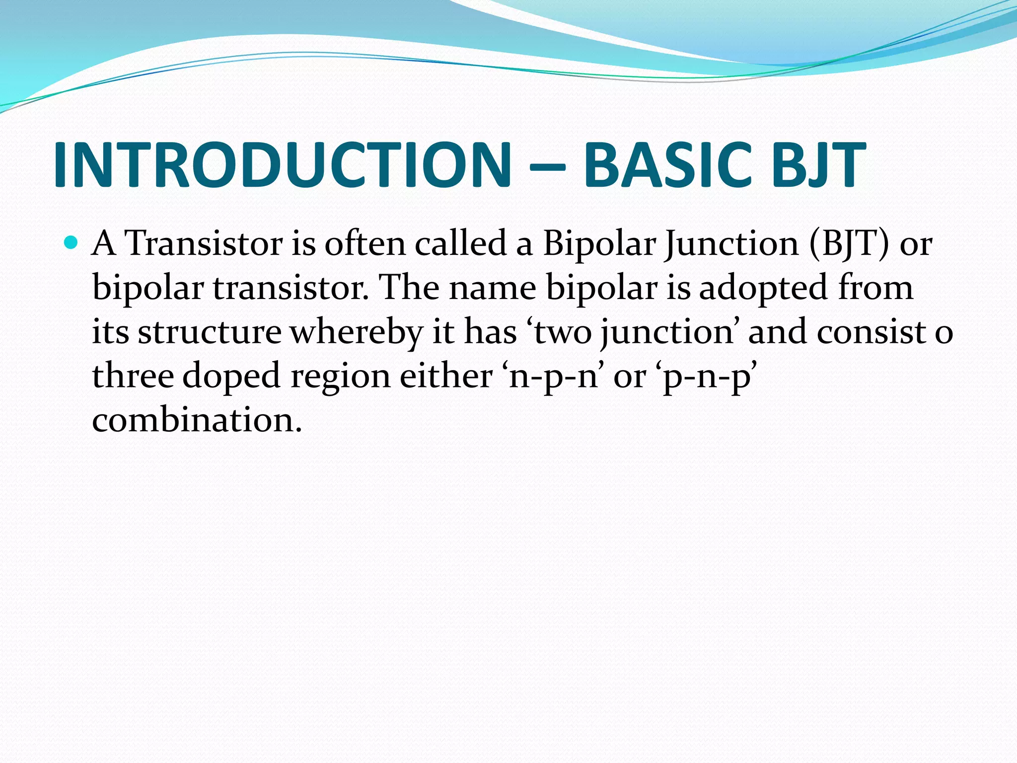 1) The basic structure of a BJT, which consists of three doped semiconductor regions forming two back-to-back PN junctions.