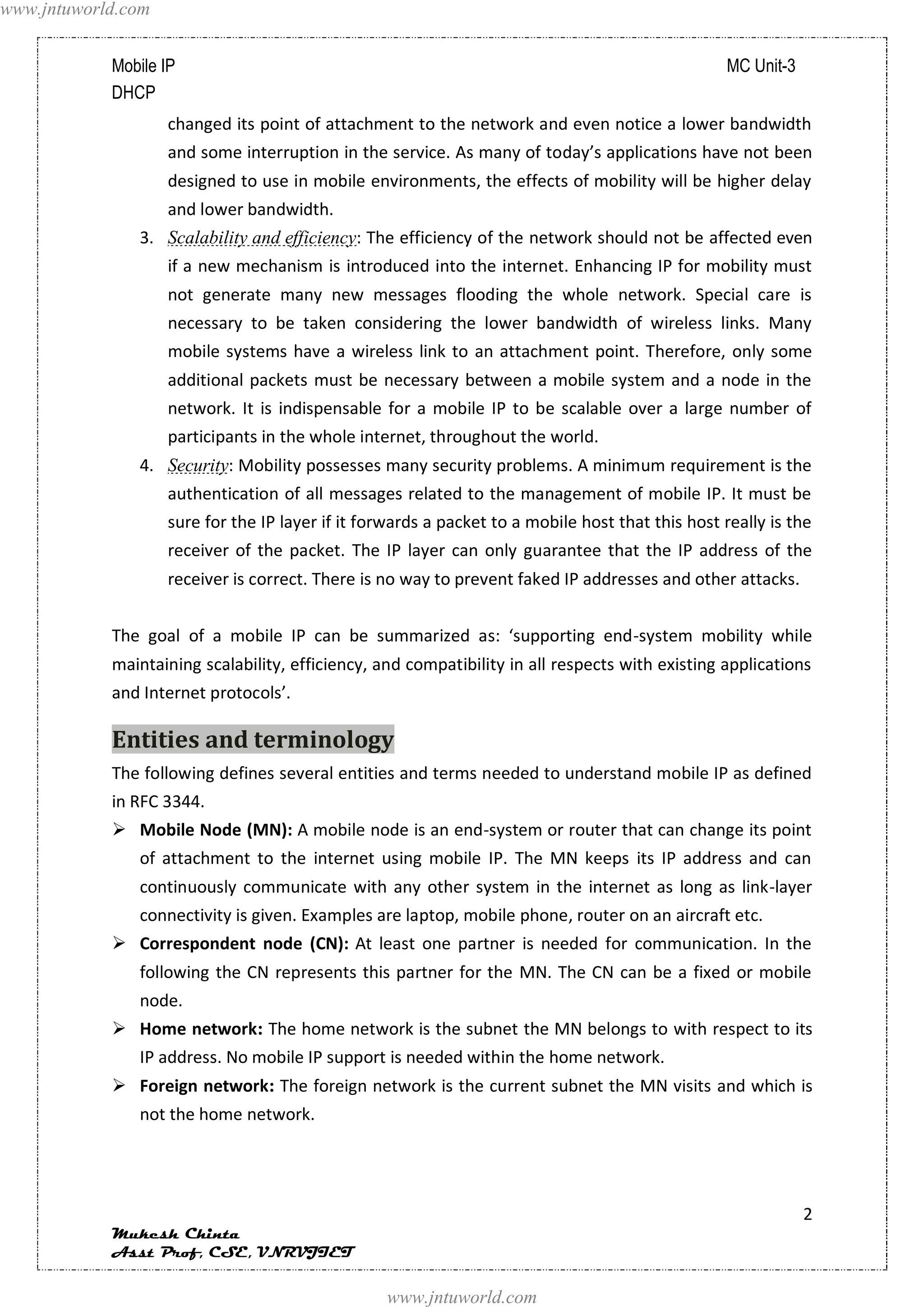 Mobile IP allows mobile nodes to change their point of attachment to the internet while maintaining the same IP address. It uses home and foreign agents and a care-of address to transparently route packets to the mobile node's changing locations. The mobile node discovers agents through advertisements, registers its care-of address with its home agent, and packets are tunneled between the home and foreign agents to reach the mobile node.