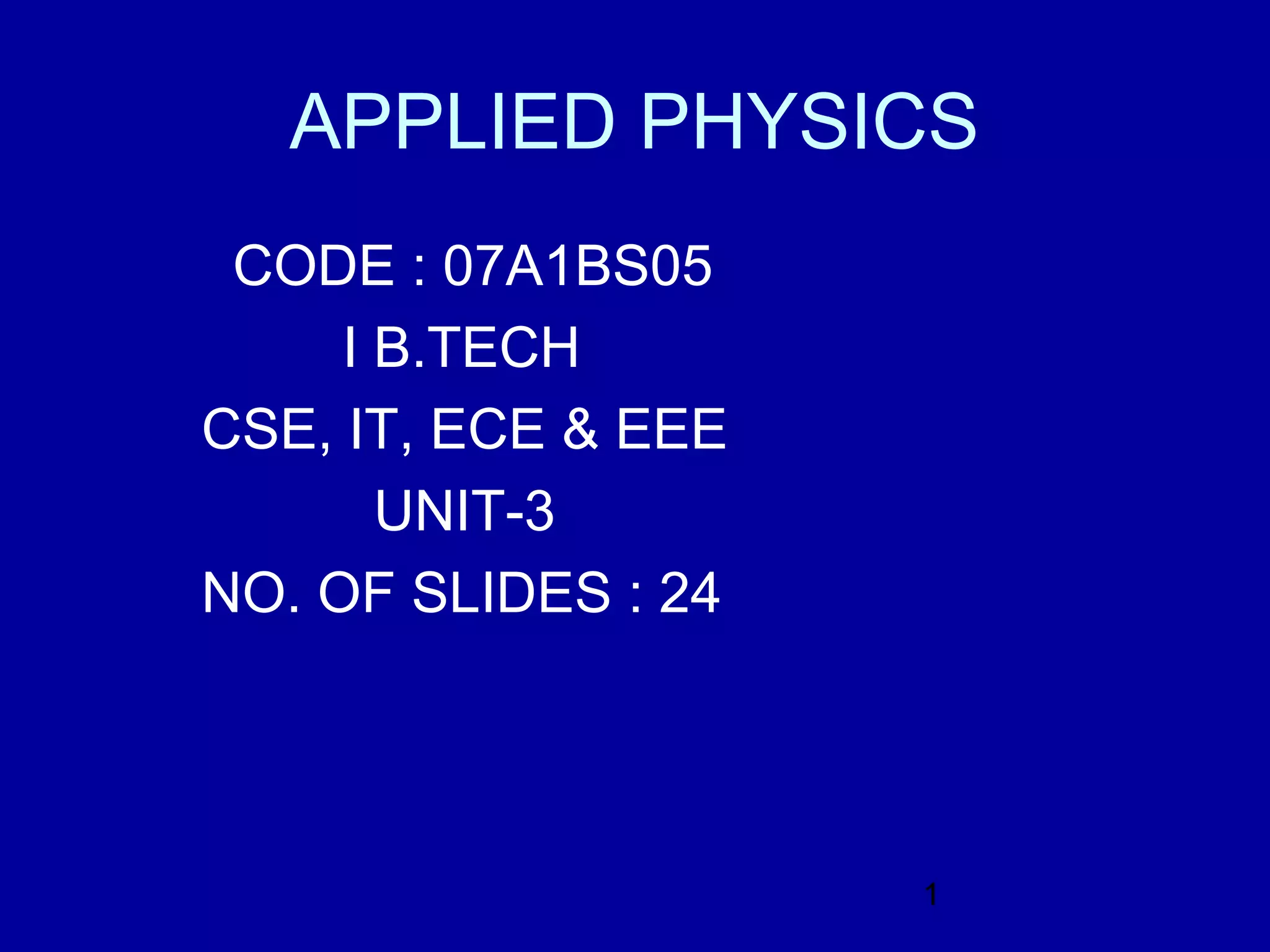 This document provides an overview of the key topics in Unit 3 of the Applied Physics course. The unit covers: