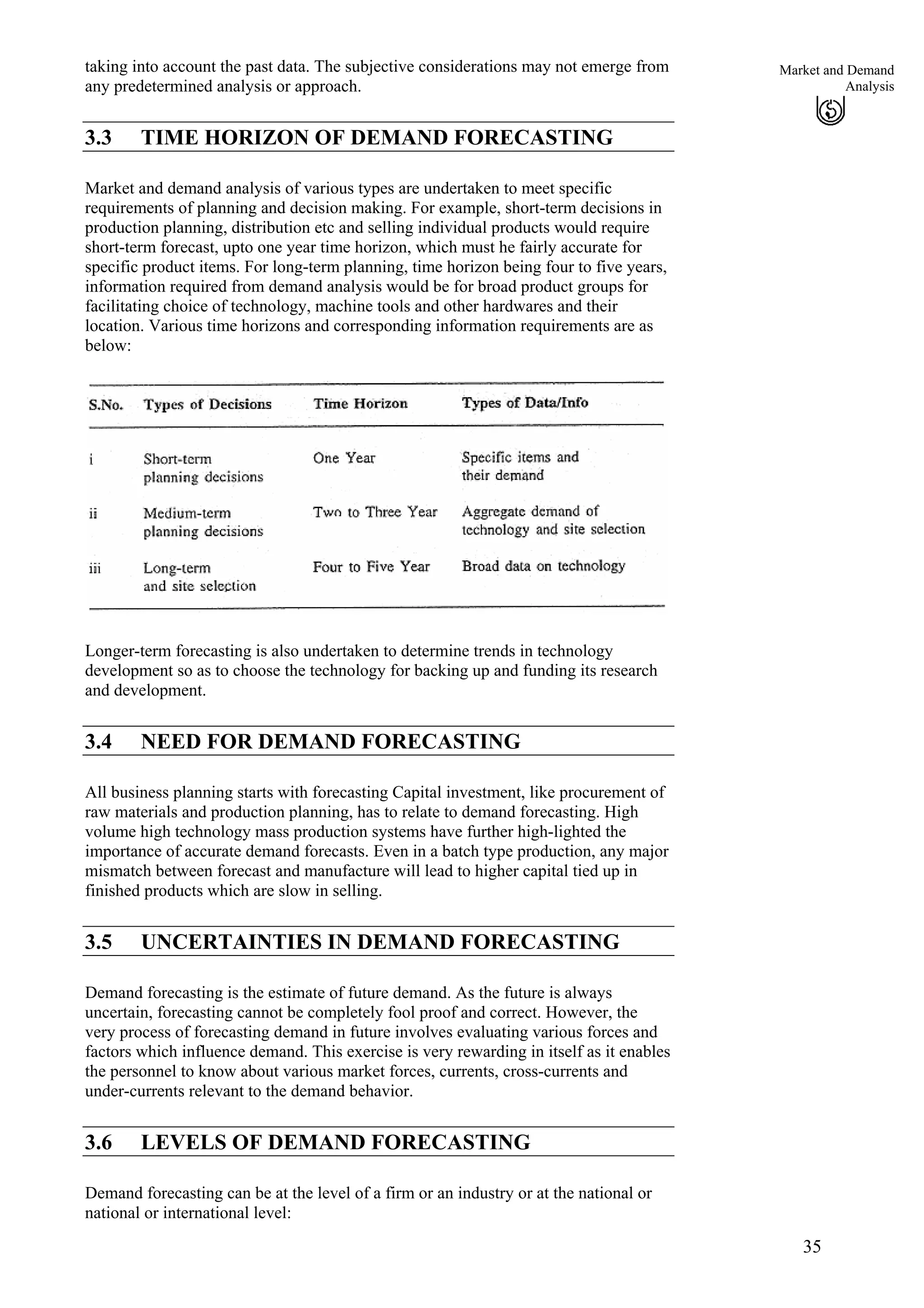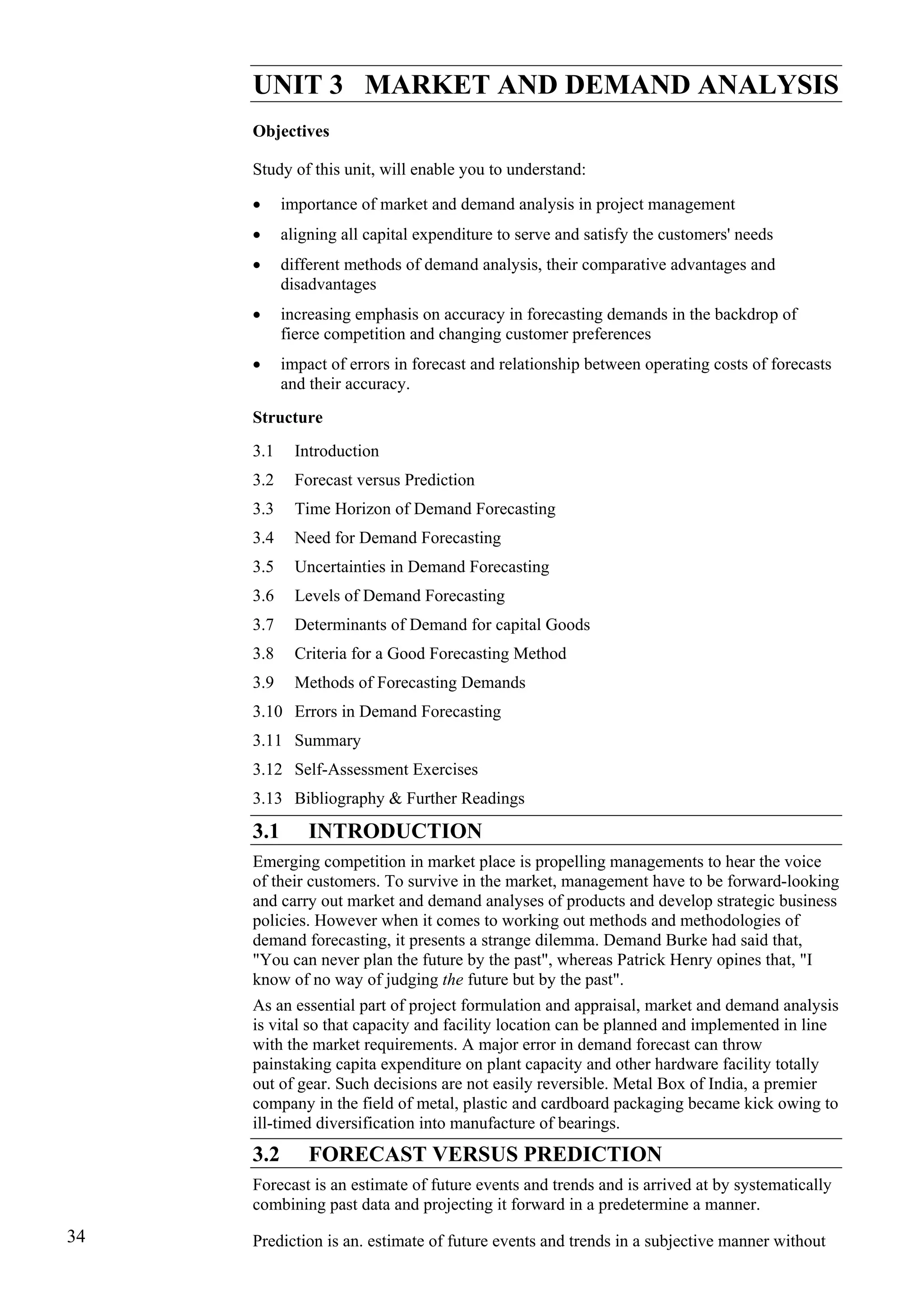 This document discusses various methods for demand forecasting that are important for project planning and investment decisions. It describes qualitative methods like surveys of collective opinions and customers' intentions, as well as quantitative techniques including simple and moving averages, weighted moving averages, and exponential smoothing methods. Accurate demand forecasting is crucial to align capital expenditures with market needs and avoid costly errors from mismatched forecasts and production levels. The selection of an appropriate forecasting technique depends on factors like the product, stability of demand trends, and availability of past sales data.