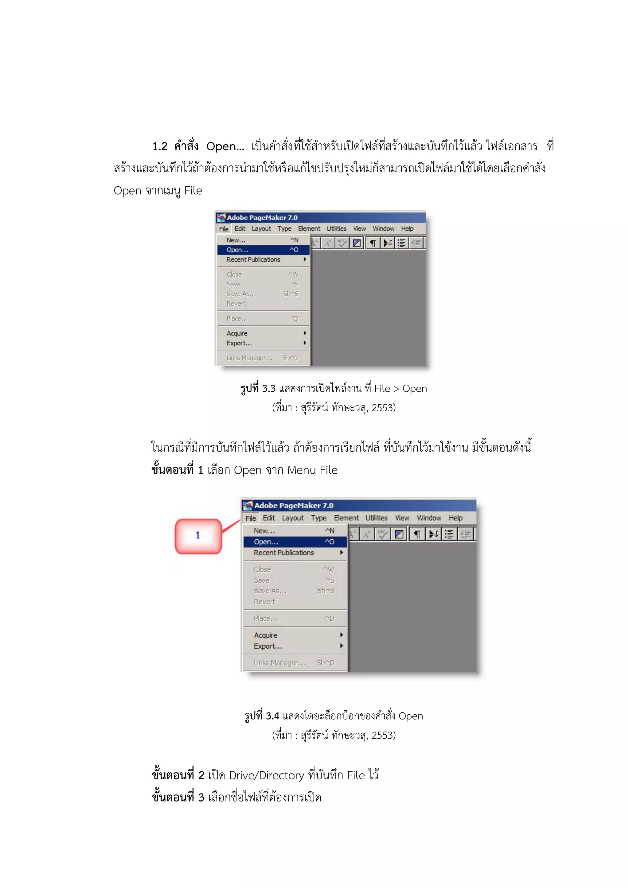 เป็นคาสั่งที่ใช้สาหรับเปิดไฟล์ที่สร้างและบันทึกไว้แล้ว ไฟล์เอกสาร ที่ สร้างและบันทึกไว้ถ้าต้องการนามาใช้หรือแก้ไขปรับปรุงใหม่ก็สามารถเปิดไฟล์มาใช้ได้โดยเลือกคาสั่ง Open จากเมนู File รูปที่ 3.3 แสดงการเปิดไฟล์งาน ที่ File > Open (ที่มา : สุรีรัตน์ ทักษะวสุ, 2553) ในกรณีที่มีการบันทึกไฟล์ไว้แล้ว ถ้าต้องการเรียกไฟล์ ที่บันทึกไว้มาใช้งาน มีขั้นตอนดังนี้ ขั้นตอนที่ 1 เลือก Open จาก Menu File รูปที่ 3.4 แสดงไดอะล็อกบ็อกของคาสั่ง Open (ที่มา : สุรีรัตน์ ทักษะวสุ, 2553) ขั้นตอนที่ 2 เปิด Drive/Directory ที่บันทึก File ไว้ ขั้นตอนที่ 3 เลือกชื่อไฟล์ที่ต้องการเปิด