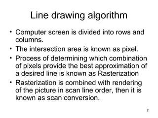 This document discusses various algorithms used for computer graphics rendering including scan conversion, line drawing, circle drawing, ellipse drawing, and polygon filling. It describes the Digital Differential Analyzer (DDA) algorithm for line drawing and Bresenham's algorithm as an improvement over DDA. Circle drawing is achieved using the midpoint circle algorithm and ellipse drawing using the midpoint ellipse algorithm. Polygon filling can be done using scan line filling or boundary filling algorithms.