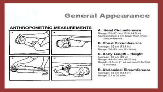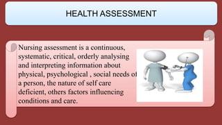 Nursing assessment is a continuous, systematic process that involves collecting and analyzing data about a person's physical, psychological, social, and other needs. There are two main components of health assessment: taking history and physical examination. A health assessment evaluates characteristics like physical, social, spiritual/cultural, and mental health. Assessments are tailored based on factors like age, from newborns to adults to elderly individuals. Comprehensive assessments involve collecting medical history, conducting a physical exam, and reviewing laboratory results.