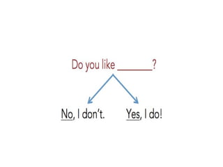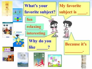 This document outlines the various subjects taught at The Cool School, including vocabulary, citizenship, English, science, arts, Spanish, music, geography, history, maths, drama, ICT, PE, and grammar. It then provides examples of using the past tense verb "to be" and questions about likes and dislikes related to these school subjects in the past tense.