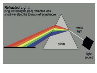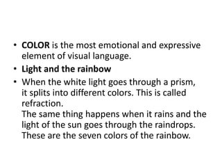 Color is the most emotional element of visual language. Light splits into the colors of the rainbow through refraction. Objects appear colored because their surfaces absorb some wavelengths of light and reflect others. Color is actually a sensation created in our brain based on the light received by our eyes. There are two types of color: colored light from pigments or dyes, and colored materials from pigments mixed with a binder. The color wheel is used to visualize and organize color relationships, such as complementary, analogous, warm, and cold colors. Artists and designers carefully consider color choices to effectively communicate feelings, ideas, and attract attention through their work.