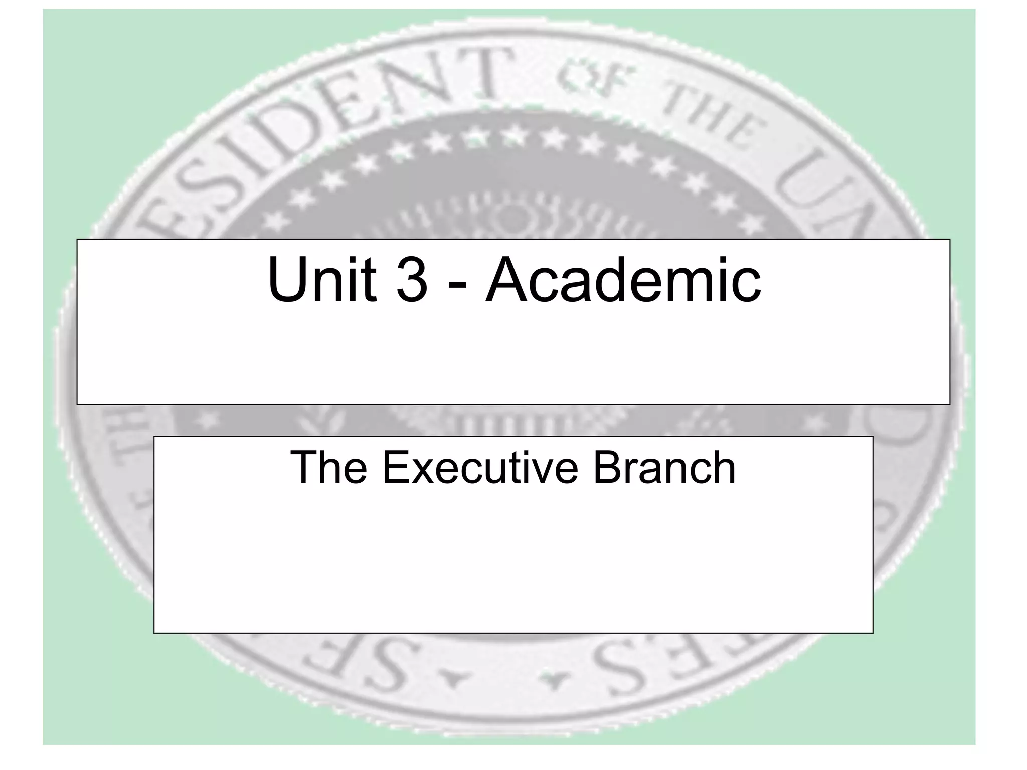 The document provides an overview of the executive branch of the US government according to Article II of the Constitution. It discusses the basic structure and roles of the presidency, vice presidency, cabinet, White House staff, civil service, and major agencies. Key points covered include the qualifications for president, duties like chief of government and commander-in-chief, and how early presidents like Washington, Adams, and Jefferson shaped the office. It also summarizes trends in perceptions of presidential power over time.