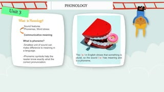 This document provides an overview of phonology, including phonemes, word stress, and connected speech. It discusses what phonemes are, how they differ in meaning between languages, and examples of phonemic writing. It also covers word stress patterns and how stress influences pronunciation. Finally, it discusses language functions like apologizing, greeting, inviting, and the exponents used to express different functions depending on the context.