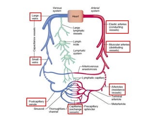 The document provides information about the cardiovascular system and the heart. It discusses the structure and functions of the heart, including the chambers, valves, conduction system, and blood flow pathways. It also covers topics like the cardiac cycle, heart sounds, electrocardiography, regulation of heart rate and blood pressure, and the different types of blood vessels. The heart pumps over 1 million gallons of blood per year to circulate oxygen and nutrients to tissues throughout the body.