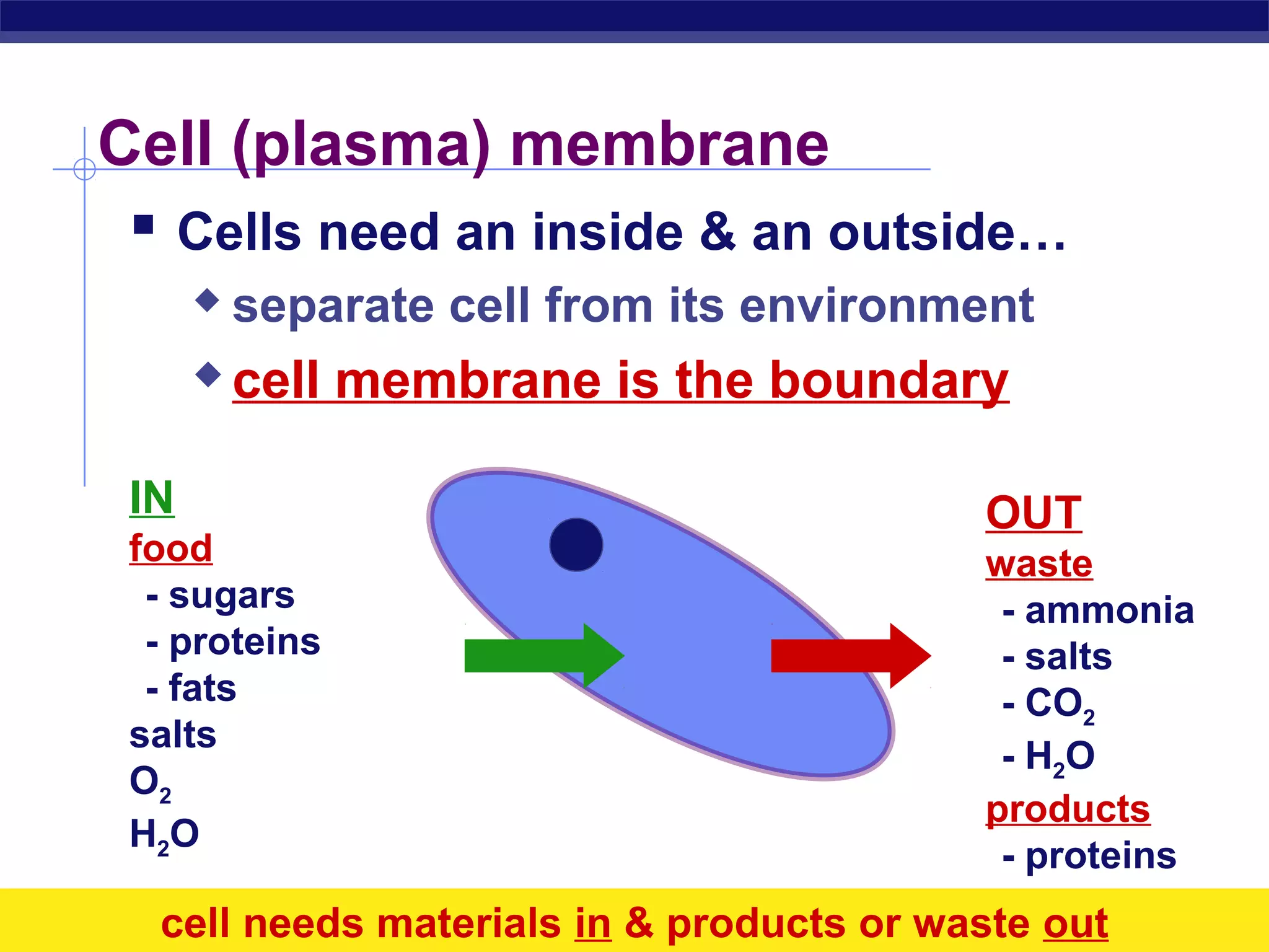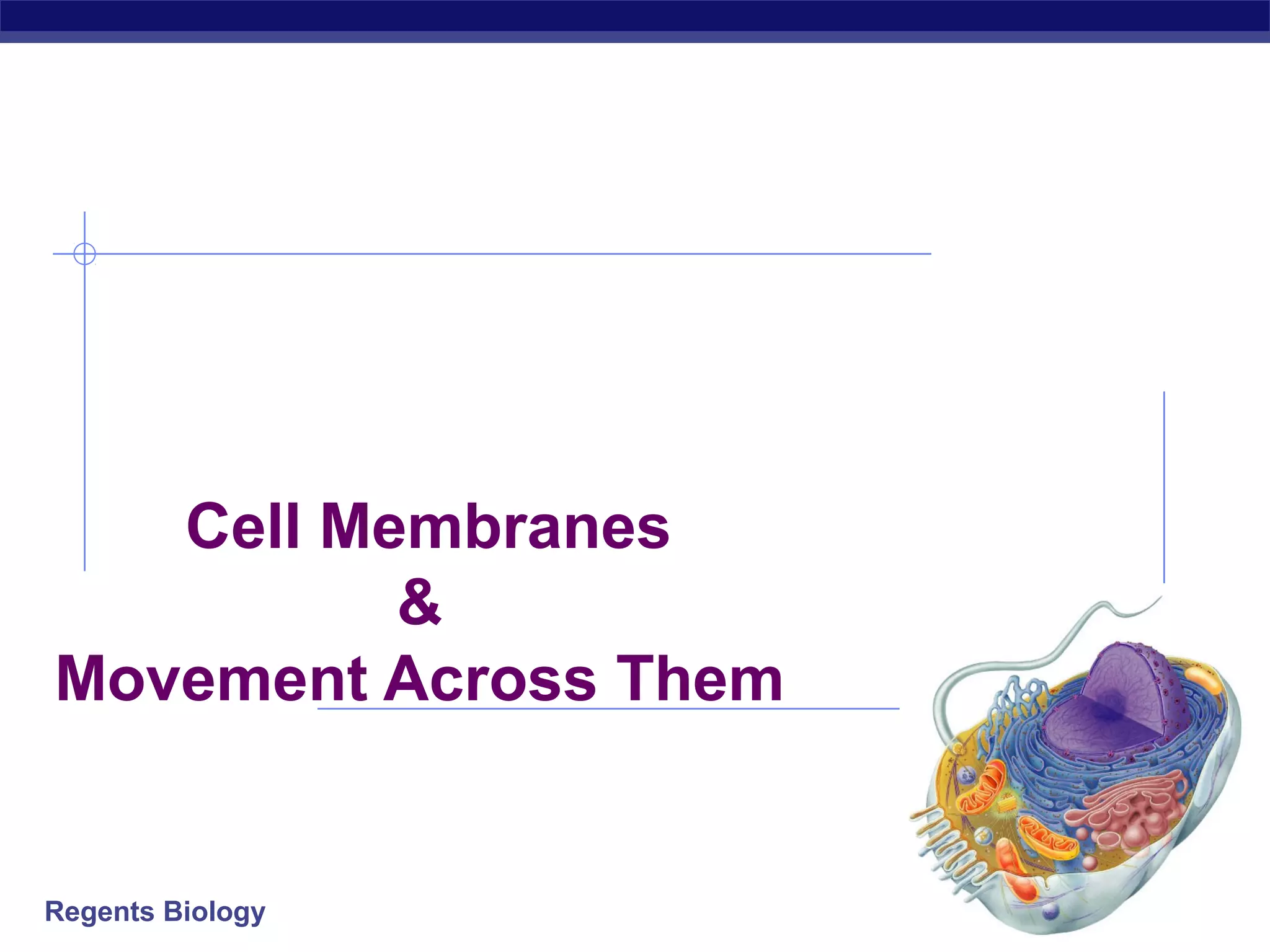 This document discusses cell membranes and movement across them. It explains that cell membranes are made of phospholipids arranged in a bilayer that acts as a semi-permeable barrier. Materials can cross the membrane through simple diffusion, facilitated diffusion using membrane channels, or active transport using protein pumps. Water specifically crosses by osmosis, moving from high to low concentration areas. Cells need to regulate water movement to avoid bursting in hypotonic solutions or shriveling in hypertonic solutions, maintaining an isotonic balance.