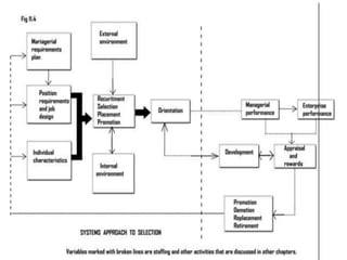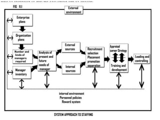 The document discusses staffing as a key managerial function that involves filling positions and developing current employees. It describes staffing as identifying workforce needs, recruiting and selecting candidates, and promoting development. An effective staffing system takes an open approach, considering both internal factors like policies and rewards as well as external factors like the availability of skilled workers. The document outlines the steps in staffing, including determining position requirements, identifying needed skills, matching qualifications to positions, selecting candidates, and orienting new employees.