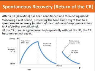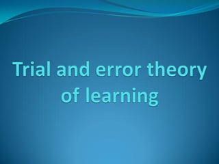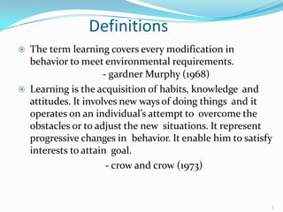 The document discusses various theories and definitions of learning, emphasizing that learning is a continuous, purposeful process involving behavior modification through experiences. Key theories include trial and error learning by Thorndike, classical conditioning by Pavlov, operant conditioning by Skinner, Gestalt psychology, and observational learning by Bandura, highlighting factors that influence learning and the laws that govern it. Educational implications of these theories suggest the importance of motivation, reinforcement, and understanding individual learner needs to enhance effective learning.