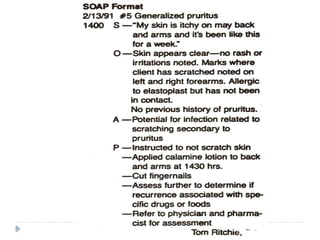 #57 This is a SOAP charting example. You can see the problem is # 5 which is generalized pruitis (this was listed on an earlier slide) and the SOAP documentation by the nurse about this problem only. If the client has several problems that required documentation each would have to be SOAP charted separately. So you can see where there might be duplication of documentation.