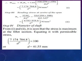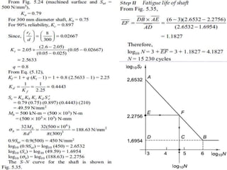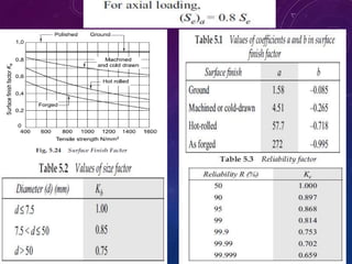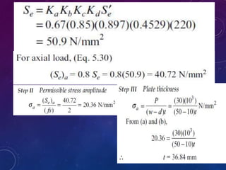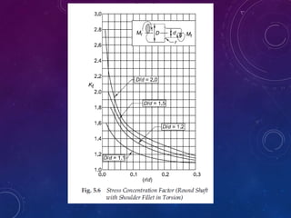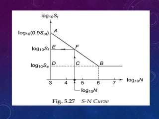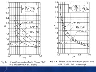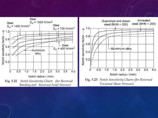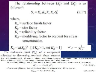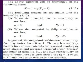 The document discusses stress concentration and fatigue failure in machine elements. It defines stress concentration as the localization of high stresses due to irregularities or abrupt changes in cross-section. Stress concentration can be reduced by avoiding sharp changes in cross-section and providing fillets and chamfers. Fatigue failure occurs when fluctuating stresses cause cracks over numerous load cycles. The endurance limit is the maximum stress amplitude that causes failure after an infinite number of cycles. Factors like stress concentration, surface finish, size, and mean stress affect the endurance limit. Designs should minimize stress raisers and protect against corrosion to prevent fatigue failures.