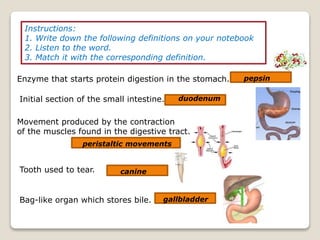 This document provides an overview of the digestive and respiratory systems. It begins by outlining the learning objectives which are to understand how the digestive and respiratory systems work, explain their key processes, recognize healthy lifestyle habits, and identify related illnesses. The document then proceeds to define key terms and components of each system, explain their functions and processes like digestion and gas exchange, discuss accessory organs, and identify some illnesses that can impact the systems.