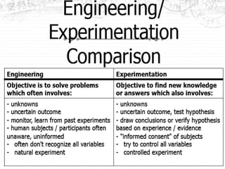 The document discusses the concept of engineering as social experimentation, emphasizing the responsibility of engineers in designing, testing, and monitoring projects to ensure safety and ethical standards. It critiques various software development models, particularly the waterfall and spiral models, and highlights the importance of codes of ethics in guiding engineers' responsibilities to society. Through case studies and discussions on industrial standards and laws, the document underscores the need for conscientious behavior, accountability, and informed consent in engineering practices.