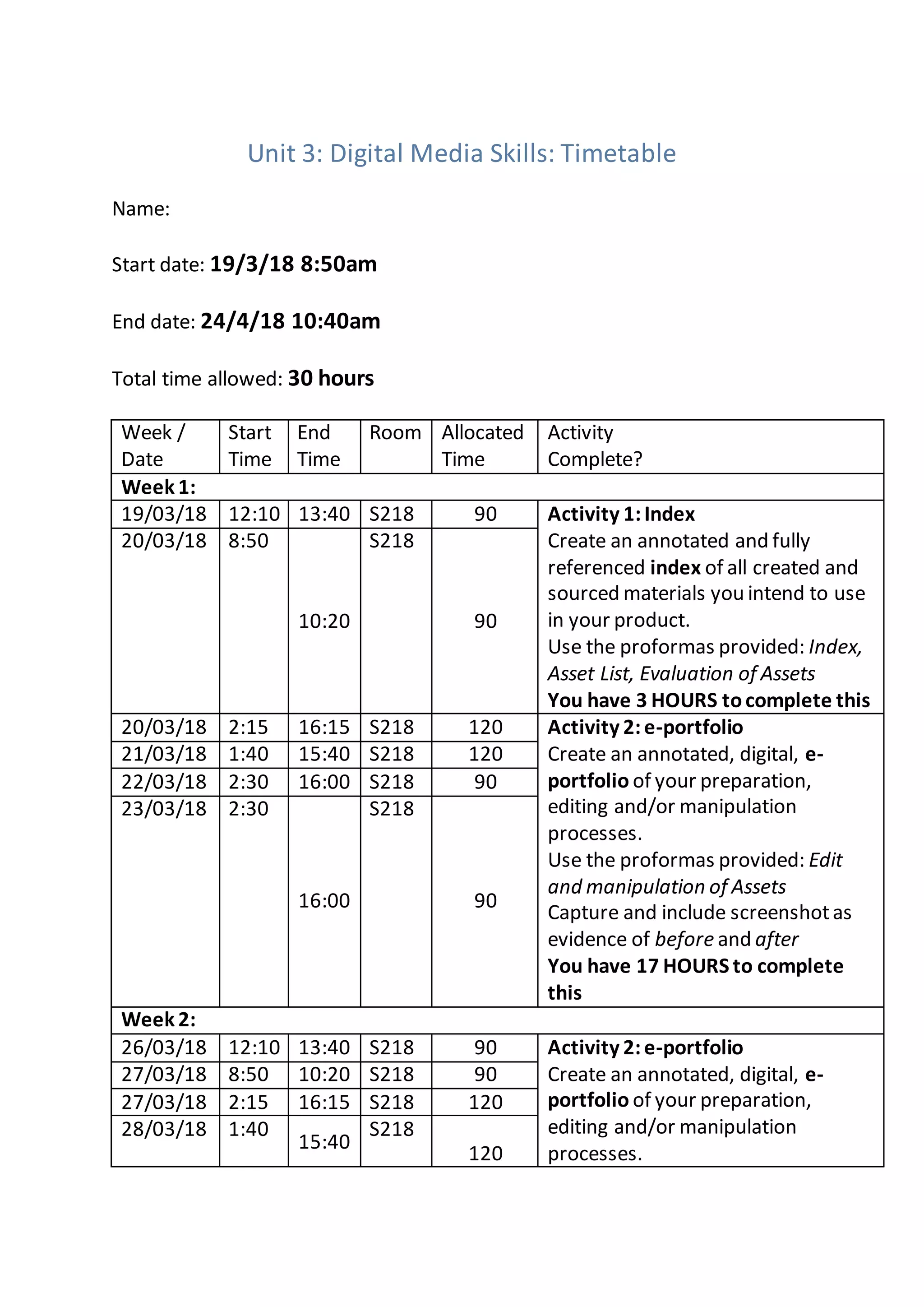 - A schedule of activities and allocated room and times for each session. Activities include creating an annotated index, e-portfolio of preparation processes, and final media product.
