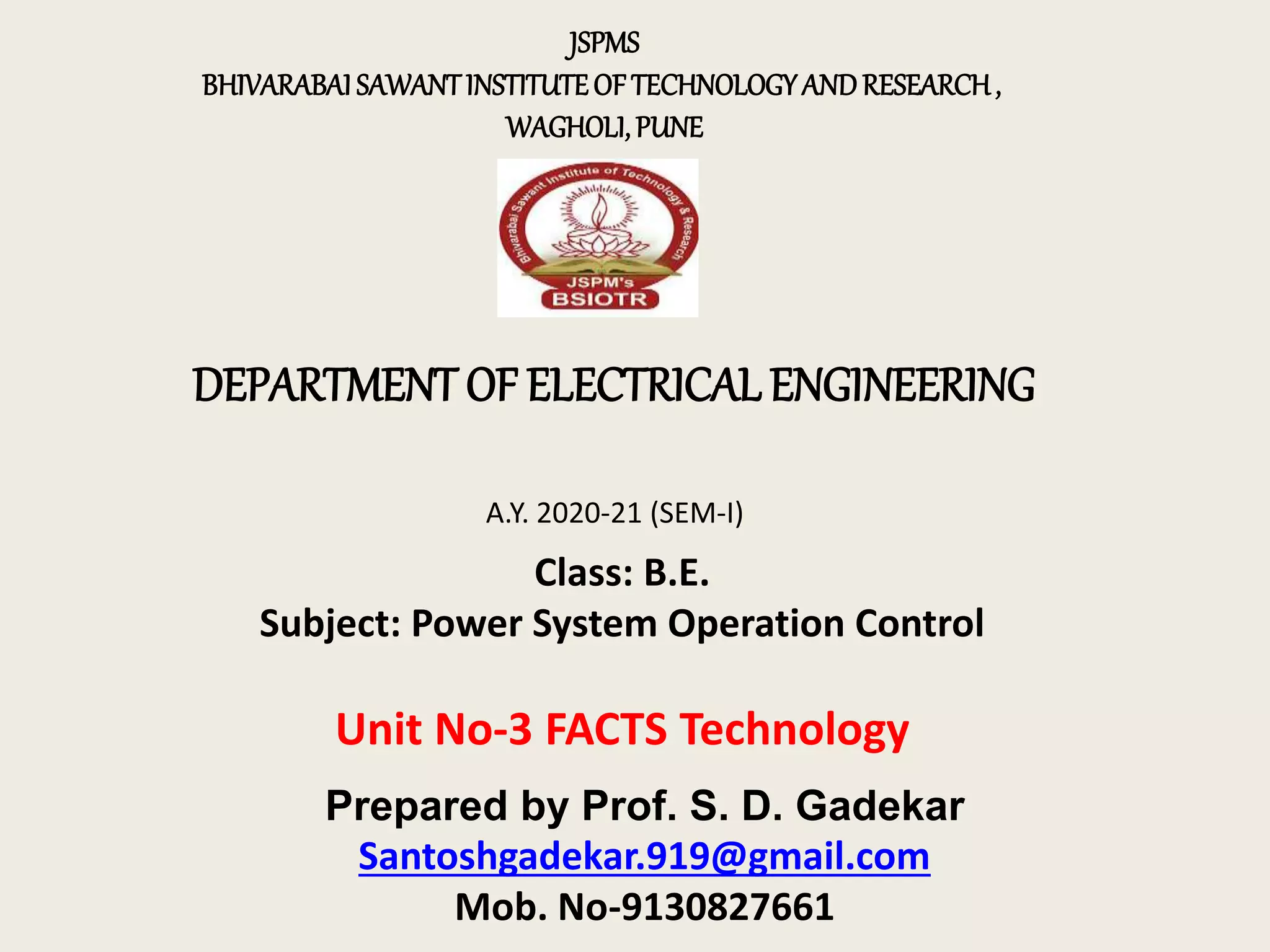 The document covers various aspects of FACTS (Flexible AC Transmission Systems) technology, detailing the necessity, classification, and applications of controllers such as SVC, STATCOM, TCSC, and UPFC. It explains the role of reactive power sources and the importance of power electronic controllers in enhancing the flexibility and efficiency of AC transmission systems. The advantages and operational characteristics of each type of FACTS controller are also discussed, highlighting their contributions to improving voltage regulation and power transfer capacity.