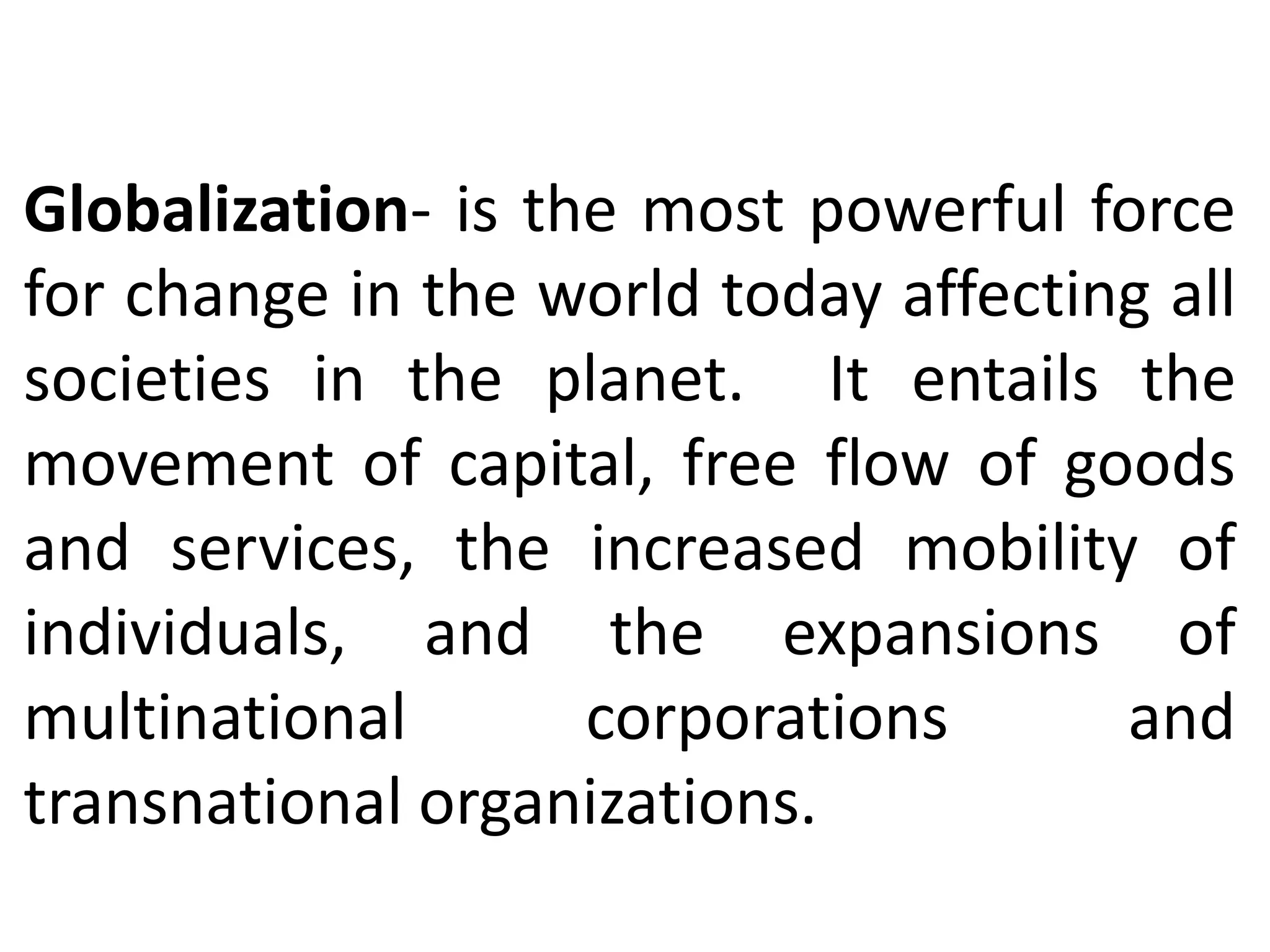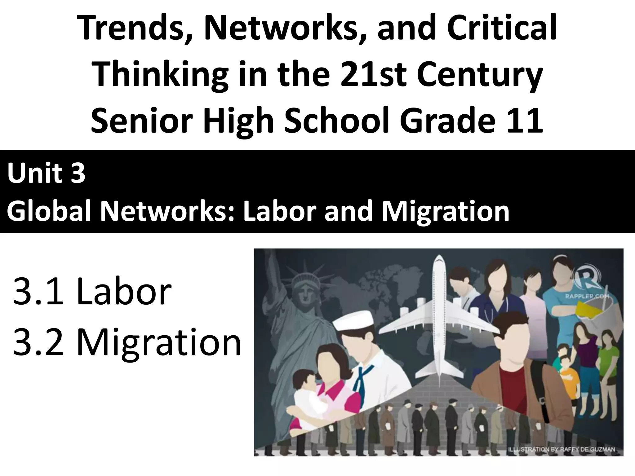 The document discusses globalization, labor, and migration trends, highlighting how globalization affects societies and the economy through increased interdependence and mobility. It outlines the reasons for migration, categorized into push and pull factors, and describes different types of migration, including internal and forced migration. Additionally, it addresses the impact of climate change on migration, noting that natural disasters are significant drivers of displacement and may lead to 'climate refugees.'