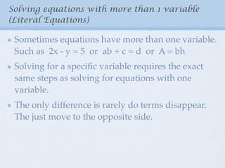 The document provides steps for solving literal equations (equations with more than one variable) by solving for a specific variable. The steps are: 1) Identify the term with the variable being solved for, 2) Move all other terms to the opposite side, 3) Isolate the variable term by undoing any operations like multiplication or division.