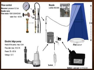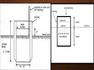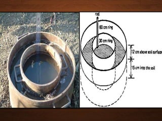 The document discusses infiltration, which is the process of rainwater entering the soil. Infiltrated water first meets any soil moisture deficit and then percolates vertically downward towards the groundwater table. The infiltration capacity of soil is the maximum rate at which it can absorb water and is denoted by f. Actual infiltration (fa) depends on whether the rainfall intensity (i) is greater than or less than the infiltration capacity. Infiltration is measured using infiltrometers and is affected by soil properties and antecedent moisture conditions.