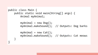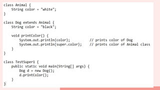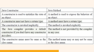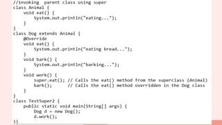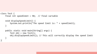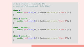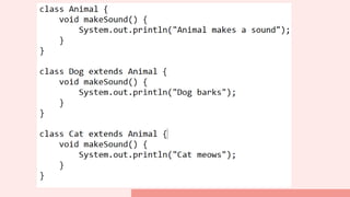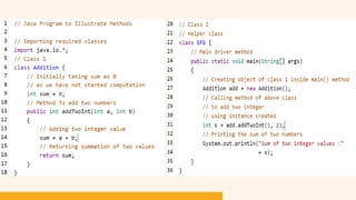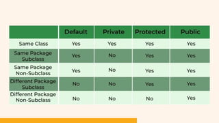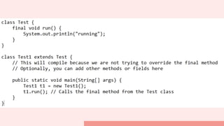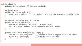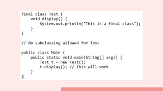 This document covers fundamental concepts of Java including classes, inheritance, constructors, methods, and access modifiers. It explains how classes serve as blueprints for objects, how inheritance promotes code reusability, and details on various types of constructors and their purposes. Additionally, it discusses packages as a way to organize classes and the importance of naming conventions and access controls in Java programming.