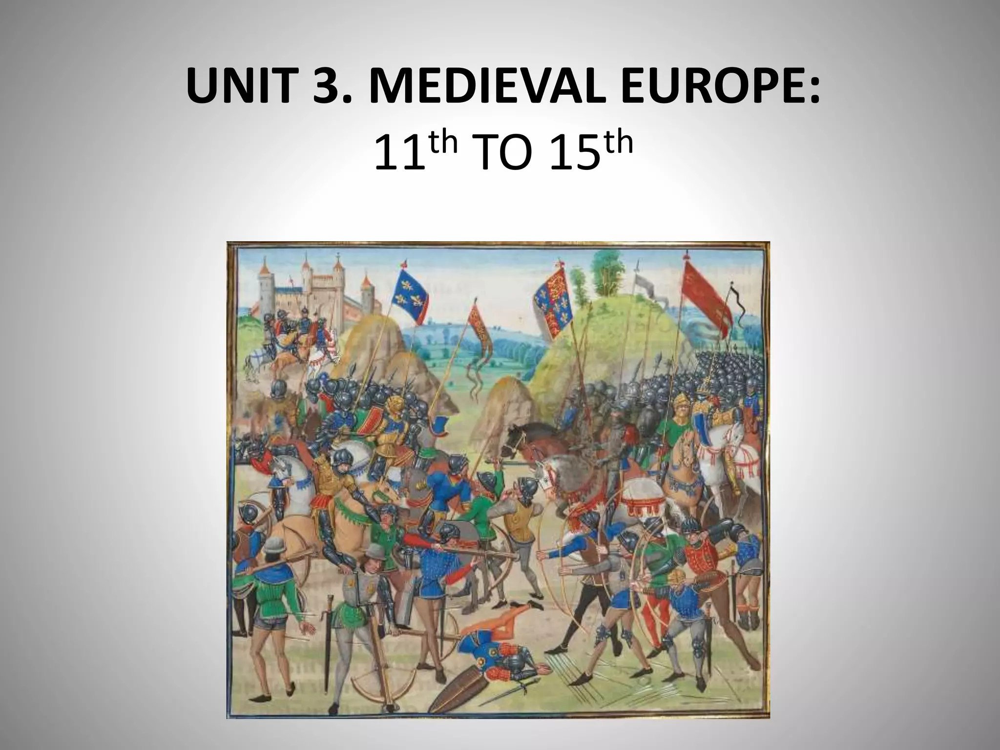 The document summarizes Medieval Europe from the 11th to 15th centuries with a focus on the Iberian Peninsula. It describes the resurgence of cities in the Late Middle Ages, the urban society that emerged, and political institutions like the papacy, Holy Roman Empire, and growing power of monarchies. It then discusses the crisis of the 14th century including religious, political, demographic, and social upheaval, as well as the end of the Middle Ages. Finally, it provides details on the political situation and expansion in the Iberian Peninsula from the 11th to 15th centuries, including the rise of Castile and Aragon as the most important kingdoms.