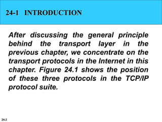 This document discusses transport layer protocols. It begins by introducing the three main transport layer protocols in TCP/IP - UDP, TCP, and SCTP. It then focuses on UDP and TCP, explaining their packet formats, features, and how they provide different types of services. For UDP, it describes how it is a simple connectionless protocol suited for applications that require low latency. For TCP, it explains how it provides reliable, in-order byte streams using connection establishment and maintenance features like flow control, congestion control, and error recovery. The document contains examples and diagrams to illustrate these concepts.