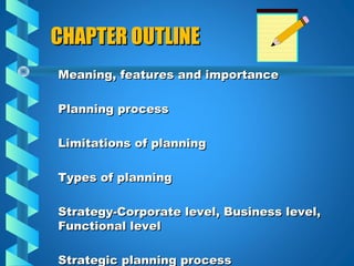 This document provides an outline on planning and strategy. It begins with defining planning as deciding in advance what to do and how to do it, noting that planning bridges the gap between the current situation and the desired future state. The document then discusses the planning process, which involves identifying opportunities, establishing objectives, evaluating alternatives, and implementing and following up on plans. It also discusses limitations of planning and how to make planning effective. Finally, it discusses different levels of strategy for organizations, including corporate, business, and functional strategies.