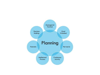 Planning is the fundamental management function that involves deciding objectives and developing courses of action to achieve objectives. It helps organizations prepare for the future. There are three types of planning: strategic planning sets long-term goals, tactical planning supports strategic plans at lower levels, and operational planning focuses on day-to-day procedures. The planning process involves establishing objectives, identifying alternatives, evaluating alternatives, selecting plans, formulating supporting plans, and establishing activity sequences. Barriers to effective planning include lack of leadership, excessive distractions, lack of proper systems, limited resources, and inadequate funding. Forecasting uses past and present data to predict future economic conditions and helps businesses plan for uncertainty.