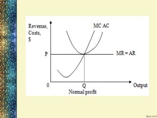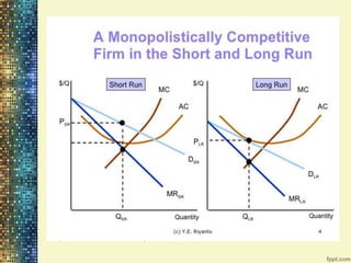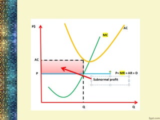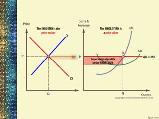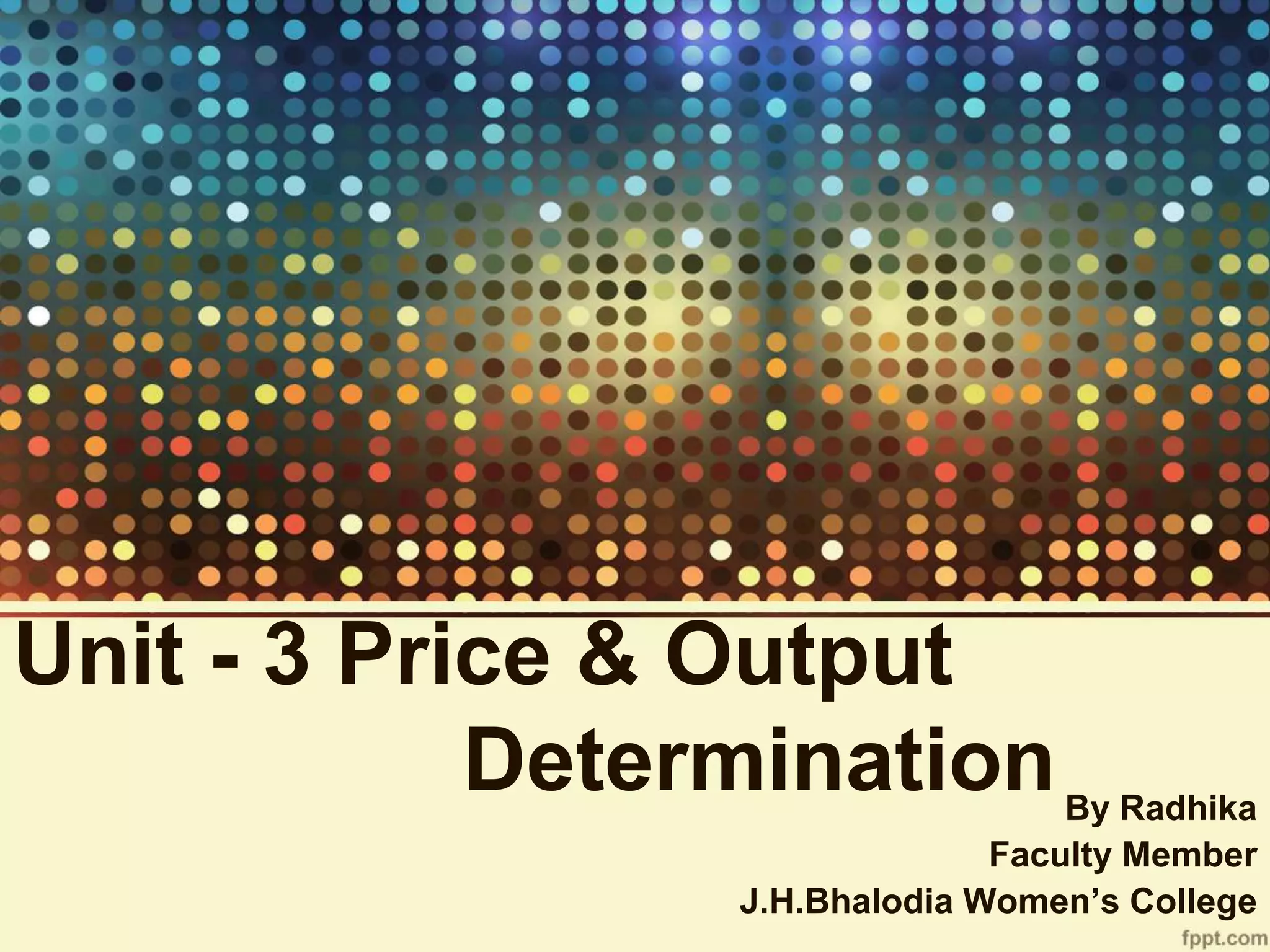 Unit - 3 Price & Output Determination discusses the key concepts of market structures including perfect competition, monopoly, monopolistic competition, and oligopoly. It examines revenue, profit, and price determination in both the short run and long run for perfect competition and monopoly. Monopolistic competition and oligopolies are also summarized, including how the kinked demand curve model explains price rigidity in oligopolies.