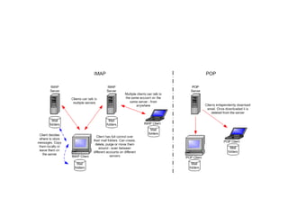 SMTP is used for email transmission and uses TCP port 25. It allows for mail, recipient, and data commands in a transaction. POP and IMAP are used for retrieving email from servers, with POP deleting emails from the server and IMAP leaving them on the server. HTTP is the underlying protocol for the web and uses port 80. FTP uses ports 20 and 21 for data and control connections. PGP provides encryption for email. Client-server and n-tier architectures partition tasks between clients and servers. Multiple protocols are needed for complex network communication due to hardware failures, congestion, and other issues.