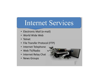 SMTP is used for email transmission and uses TCP port 25. It allows for mail, recipient, and data commands in a transaction. POP and IMAP are used for retrieving email from servers, with POP deleting emails from the server and IMAP leaving them on the server. HTTP is the underlying protocol for the web and uses port 80. FTP uses ports 20 and 21 for data and control connections. PGP provides encryption for email. Client-server and n-tier architectures partition tasks between clients and servers. Multiple protocols are needed for complex network communication due to hardware failures, congestion, and other issues.
