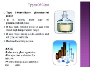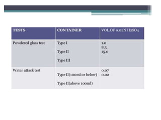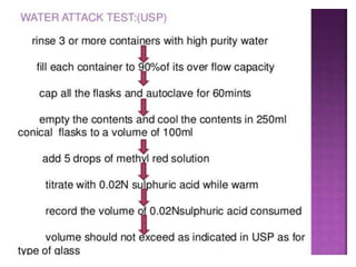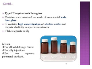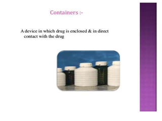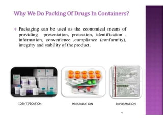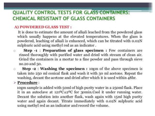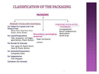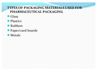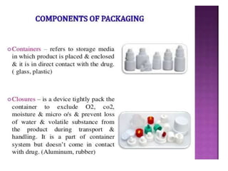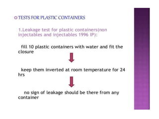 This document discusses quality control tests for pharmaceutical packaging materials. It defines primary, secondary, and tertiary packaging. Primary packaging directly contains the product, secondary provides additional protection, and tertiary is for bulk handling and shipping. Some key quality control tests mentioned for containers include permeation testing to check for transmission of gases, vapors, or liquids through packaging materials. For rubber closures, common quality control tests evaluate properties like extractable content and curing. Proper quality control testing ensures packaging and closures maintain product quality and integrity during storage and distribution.