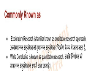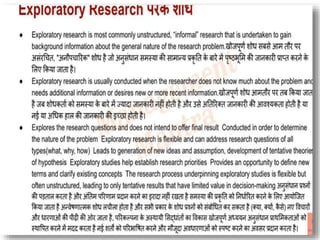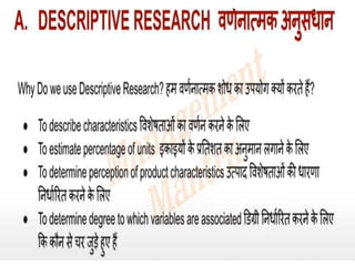 This document discusses research design and its key components. It outlines the basic stages of research design including understanding research design, descriptors of research design, and major types of research designs. Research design provides a blueprint, plan, and framework to guide a study. Descriptive studies aim to determine what, who, when and where through monitoring and communication. Research design considers categories like the level of crystallization of the research question, data collection methods, the researcher's ability to influence variables, study purpose, time dimension, scope, environment, and participant awareness.