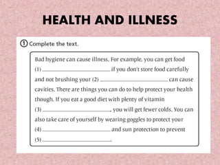 This document discusses health, illness, diseases, and advances in science. It covers topics like cuts, burns, nosebleeds, healthy habits, and diseases. The document appears to be about science related to health and illness written by a teacher named Ana.