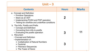 The document discusses the concept of stacks, detailing their operations such as push and pop, and the conditions for overflow and underflow. It also explains infix, prefix, and postfix notations for arithmetic expressions and includes algorithms for converting between these notations. Additionally, it provides examples of stack implementation in C, as well as exercises to reinforce the concepts presented.