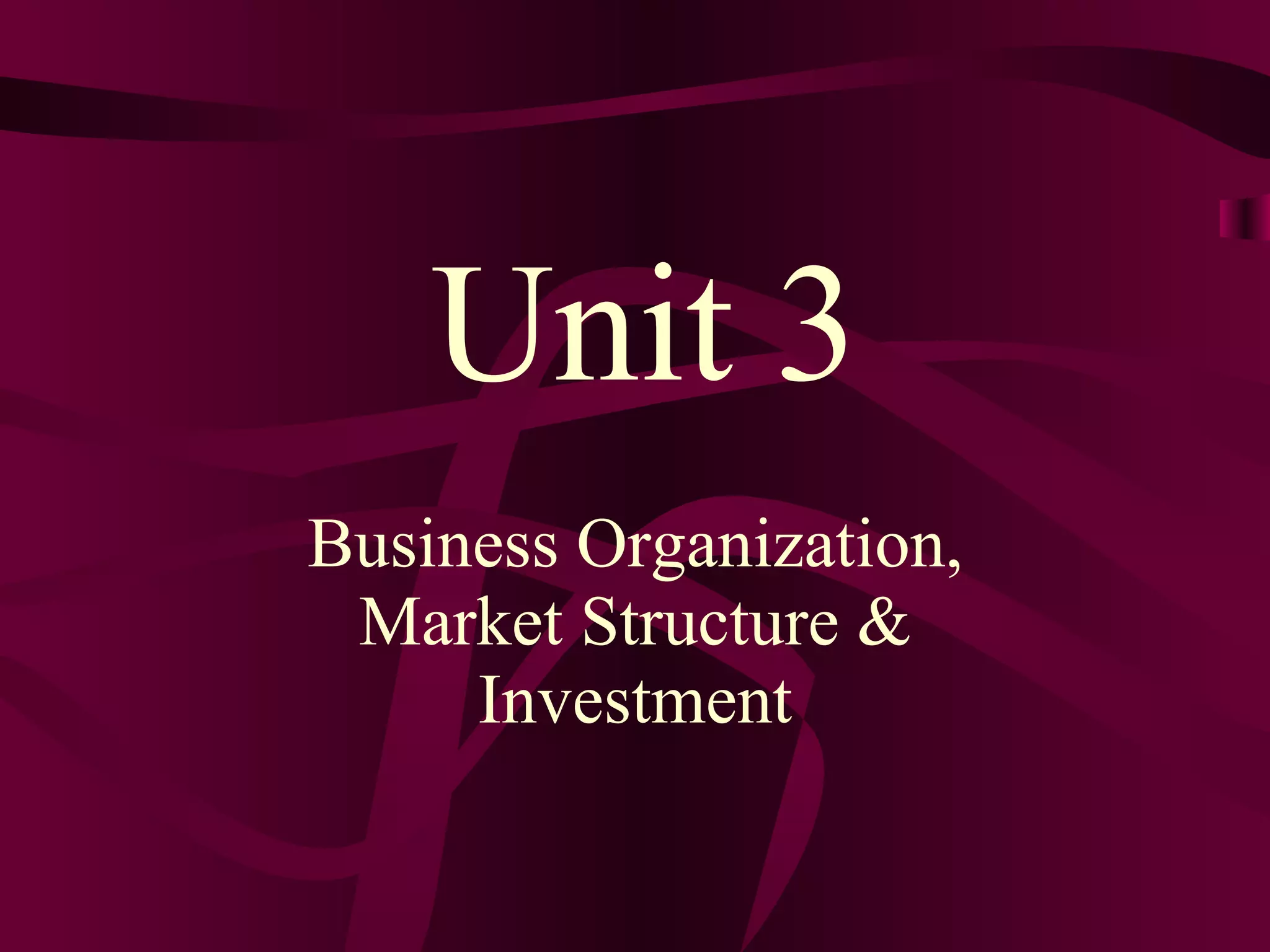 The document discusses different types of market structures and investments. It describes the four main types of market structures - perfect competition, monopolistic competition, oligopoly, and monopoly - based on factors like the number of producers, product similarity, and barriers to entry. It also outlines different investment options like bonds, CDs, stocks, and mutual funds, noting their characteristics, risks, and potential returns. The stock market and different stock types are explained. Overall, the document provides a high-level overview of market structures and common investment vehicles.