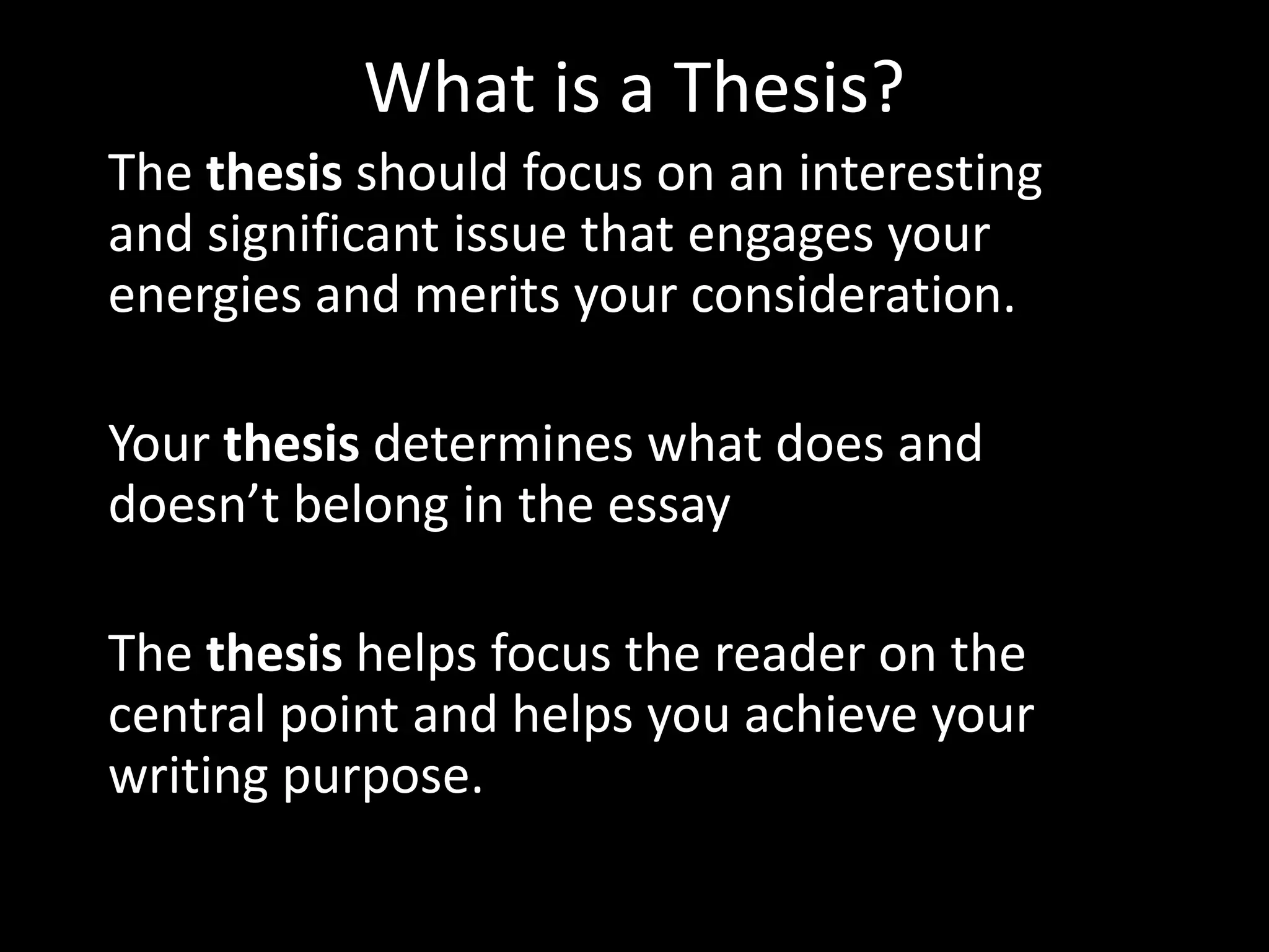 The document provides guidance on writing an effective thesis statement. An effective thesis has two parts: it presents the paper's limited subject and the author's point of view about that subject. Examples are given of effective theses that use comparison/contrast, illustration, and cause and effect. The thesis should establish a tone and not be too opinionated, factual, broad, or an announcement. An implied pattern of development like compare/contrast should also be included. The thesis is typically located in the introduction but may be delayed if needed. It should be restated in the conclusion.