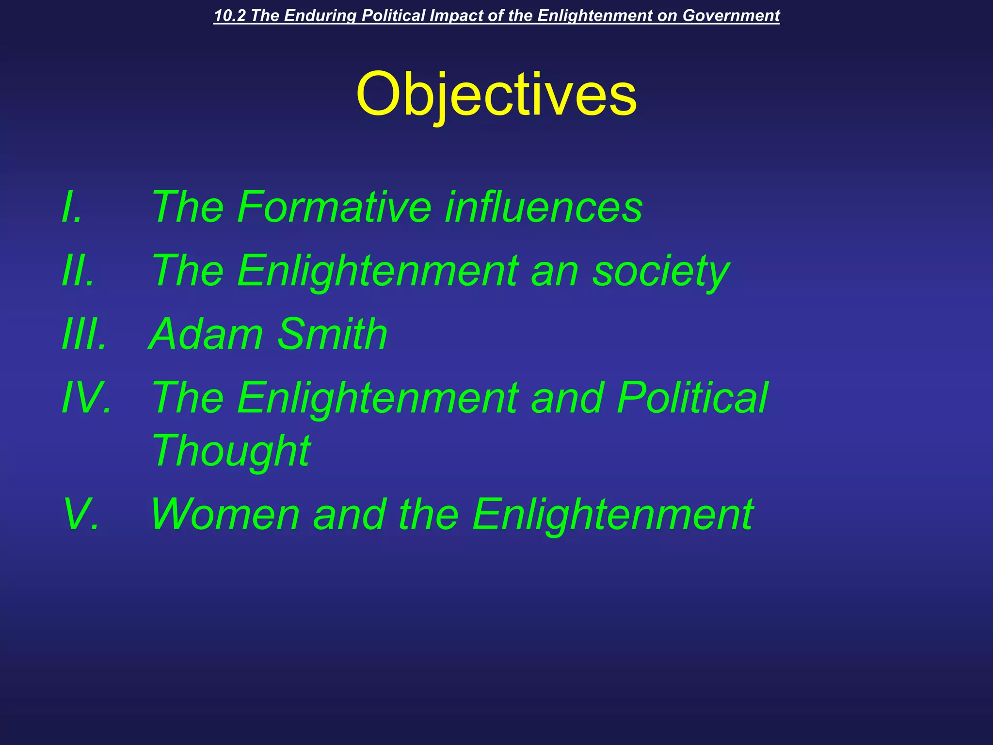 The Enlightenment promoted the use of reason and science to understand the world, influenced by thinkers like Locke and Newton. It advocated for religious tolerance in Britain and spread ideas through print culture. Voltaire, Diderot, and Beccaria used their writings to promote tolerance and reform unjust laws. Adam Smith advocated for free markets and criticized mercantilism. Montesquieu's ideas of separation of powers and checks and balances influenced the U.S. Constitution. Rousseau believed people were originally good but corrupted by society. Though most Enlightenment thinkers did not advocate for women's rights, salons run by women and works by Wollstonecraft began expanding women's role.