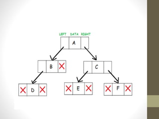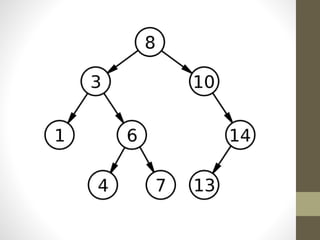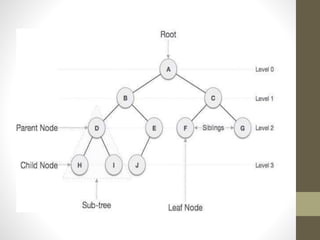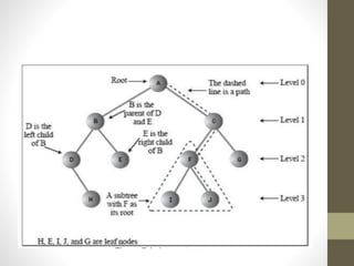 Trees are hierarchical data structures used to represent data with parent-child relationships. A tree has a root node with child nodes, and each non-root node has one parent. Trees allow fast search, insertion, and deletion similar to linked lists but can also maintain ordering like arrays. Binary trees restrict nodes to at most two children, enabling efficient search, storage of expressions, and routing algorithms. Binary search trees organize nodes to enable fast lookups based on key values.