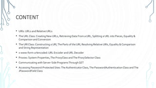 The document discusses URLs, URIs, and the URL and URI classes in Java. It covers: