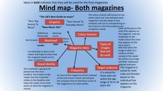 This document provides information and ideas for developing two music magazines targeted at 16-30 year olds. It discusses color schemes, mastheads, images, frequencies, and target audiences for the magazines. Font styles, graphic layouts, and mockups are proposed for the magazine covers and sample double page spreads. Key details include using red, white, black and blue colors; releasing issues monthly; and focusing on genres like indie, alternative and rock. Fonts and cover designs are selected to be bold and visually appealing to the intended audience.