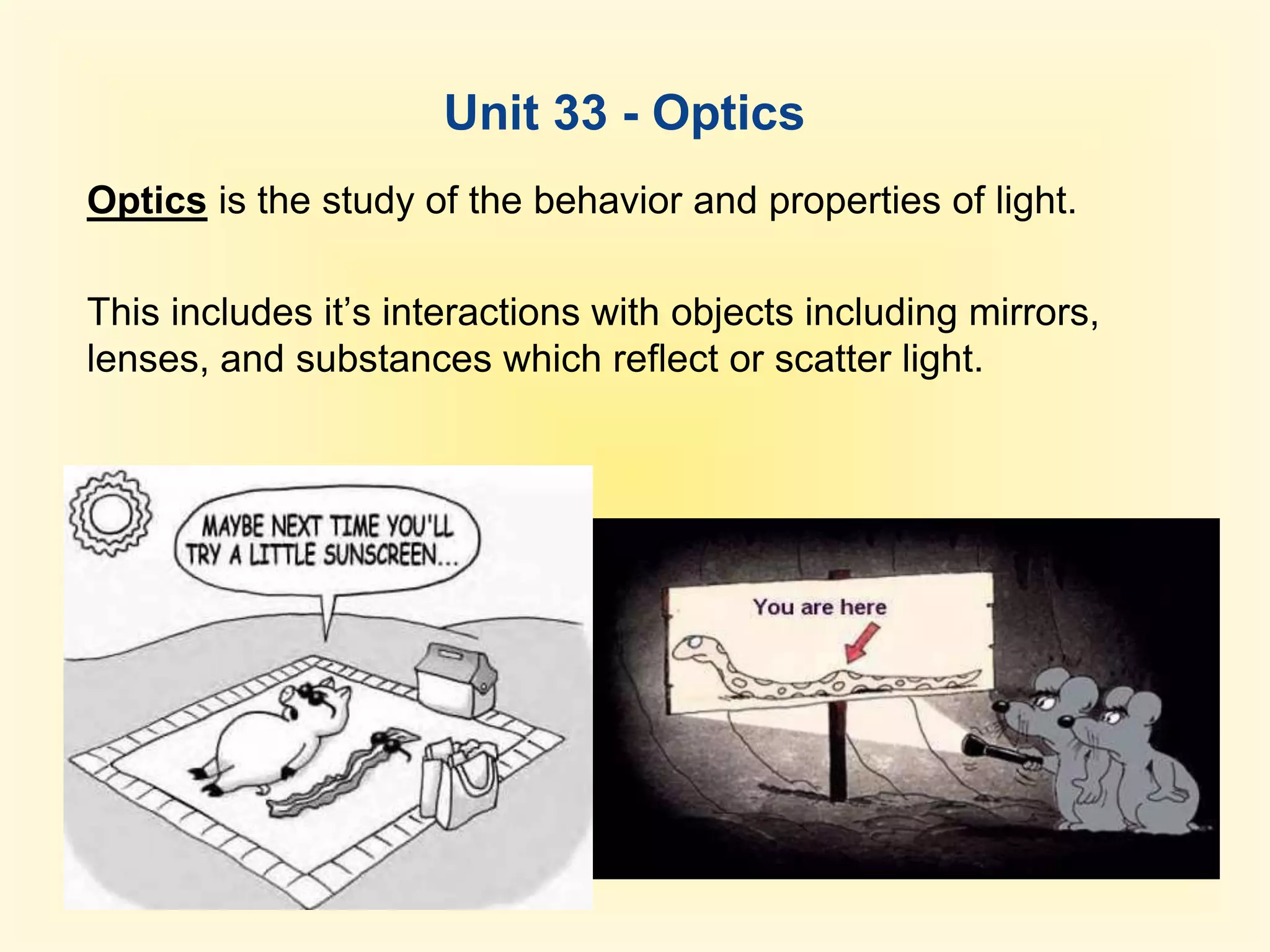 Optics is the study of light, including its interactions with mirrors, lenses and other objects. When light strikes an object it can be reflected, transmitted, scattered or absorbed. Mirrors come in three types - plane, concave and convex. Plane mirrors reflect light at the same angle it is received. Concave mirrors curve inward and can form real or virtual images, while convex mirrors curve outward and always form virtual images. Lenses also come in concave and convex forms, with convex lenses able to form real or virtual images depending on the object position. Optical instruments like telescopes, microscopes and cameras use lenses and mirrors to collect, focus and magnify light and images.