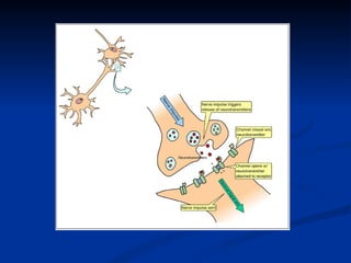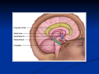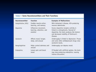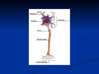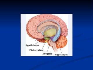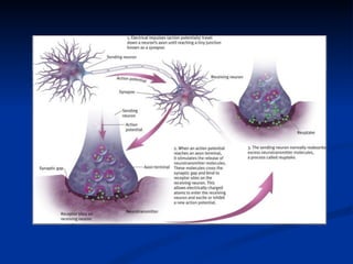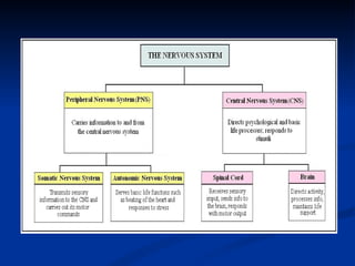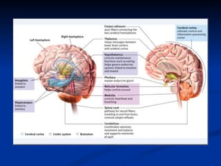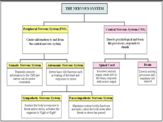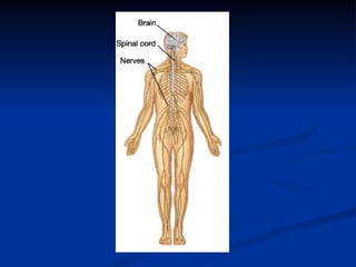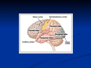 The document discusses the nervous system and brain. It describes the central and peripheral nervous systems, including the somatic and autonomic divisions. It then covers neurons, neurotransmitters, and the main structures and functions of the brain like the cerebral cortex and limbic system. Finally, it discusses brain imaging technologies, disorders like dementia and Alzheimer's, and how electrical stimulation can be used to study the brain.