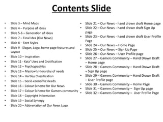 Our News is envisioned as a platform where people can report on and discuss world news and events in real time, and share their opinions. Sketches of prototype home, signup, and profile pages are presented for Our News and The Gamers Community.