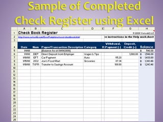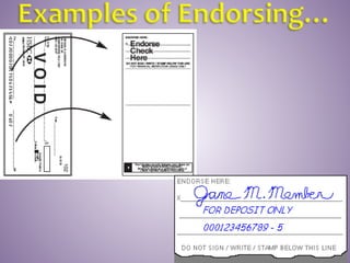 This document provides instructions on how to properly manage and use a checking account. It explains the key parts of a check, how to correctly write checks including spelling out numeric amounts, the importance of avoiding writing checks to cash, how to record checks in a check register, how to reconcile the register with bank statements each month, how to endorse checks, and what overdraft protection is and how it works to protect against insufficient funds.