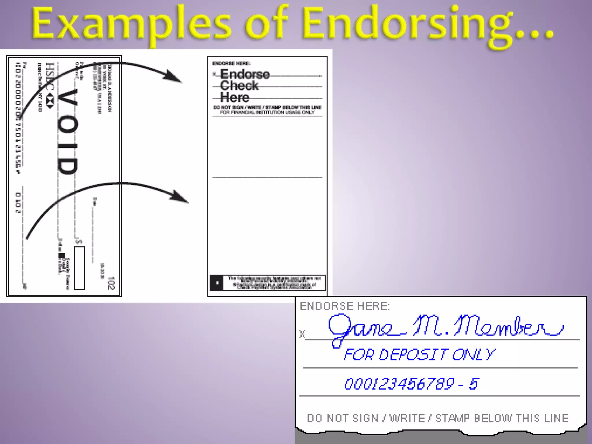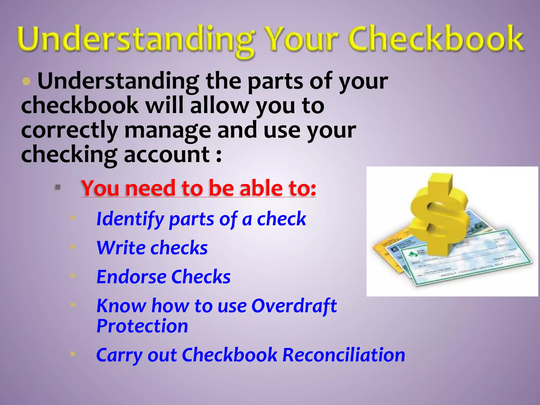This document provides instructions on how to properly manage and use a checking account. It explains the key parts of a check, how to correctly write checks including spelling out numeric amounts, the importance of avoiding writing checks to cash, how to record checks in a check register, how to reconcile the register with bank statements each month, how to endorse checks, and what overdraft protection is and how it works to protect against insufficient funds.