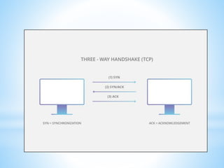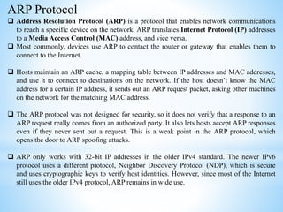 This document discusses several cybersecurity topics including ARP spoofing, password cracking, WEP vulnerabilities, MAC flooding, IP spoofing, and SYN flood attacks. It provides details on how each works and potential prevention and mitigation techniques. ARP spoofing allows attackers to intercept network traffic by spoofing MAC addresses. Password cracking involves recovering passwords through methods like brute force attacks or rainbow tables. WEP has security flaws in its use of short, static IVs and lack of integrity checks. MAC flooding overwhelms switches by sending fake MAC addresses. IP spoofing and SYN floods are types of DDoS attacks that respectively modify source IP addresses or abuse the TCP three-way handshake. Defenses include ingress filtering, egress filtering, and SYN cookies.