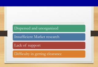 This document discusses micro, small and medium enterprises (MSMEs) in India. It provides definitions for small scale industries based on investment ceilings. MSMEs are vital for development as they generate employment, promote entrepreneurship and innovation. In India, MSMEs contribute 8% of GDP and provide 60 million jobs. They face problems around financing and policies aim to promote their growth. The government supports MSMEs through various programs and policies. Liberalization created opportunities but also challenges for the sector to become more competitive.